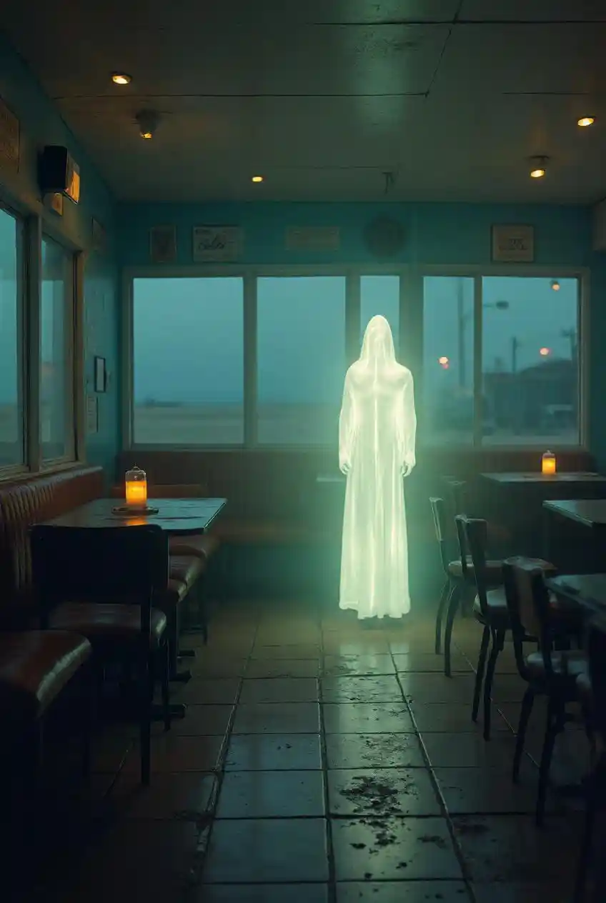 In a quiet diner at the edge of nowhere, a glowing figure waits in silence. Time feels frozen, reality blurred. Who—or what—is this luminous presence? Write a story, poem, or dialogue that explores the mystery of this being and the reason for their visit to such an ordinary place