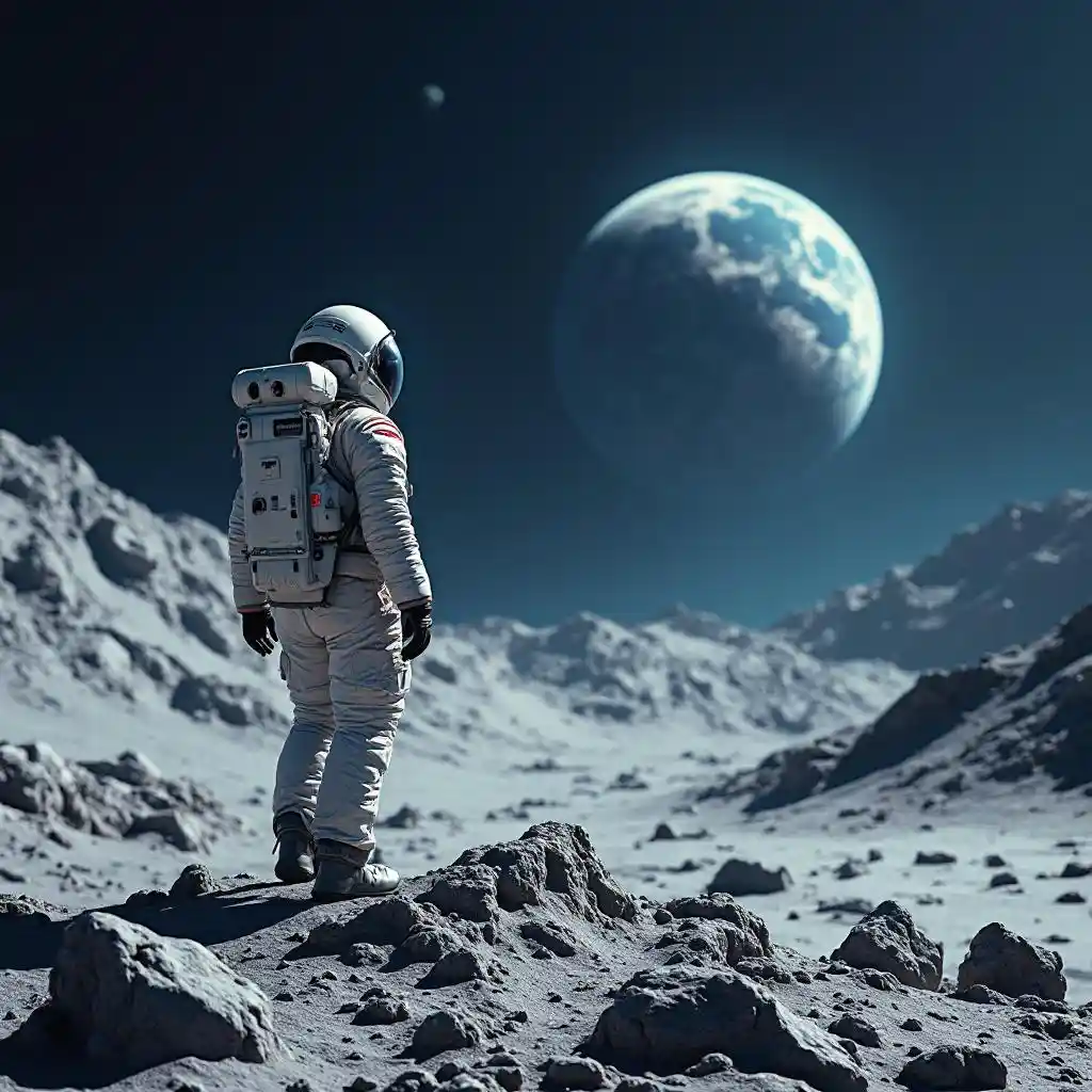 Futuristic astronaut walking on a space base on the Moon. This astronaut is standing on top of a lunar crater contemplating the view of planet Earth.