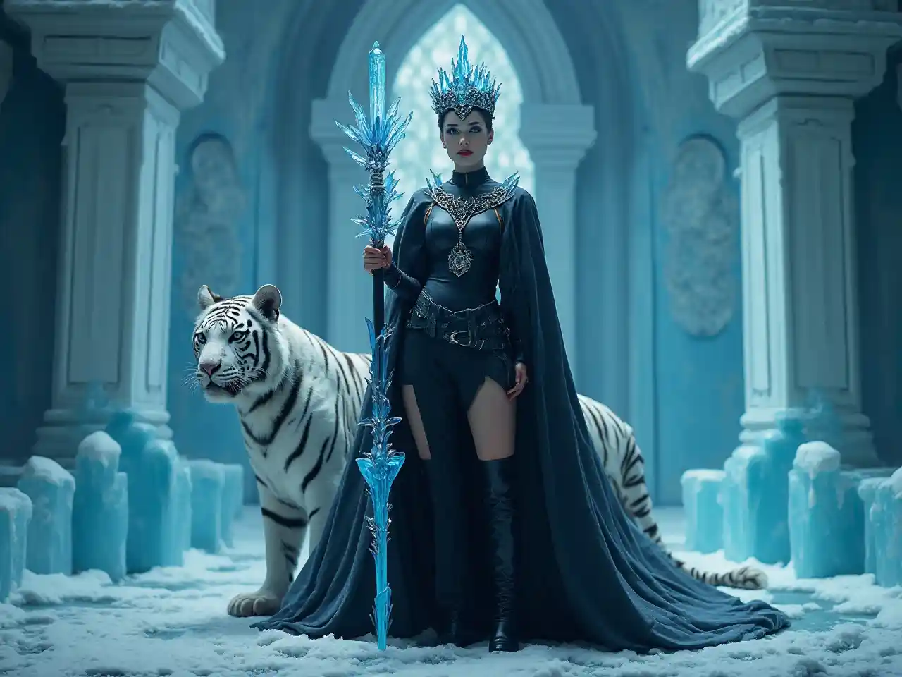 Cinematic photo of Mab, Queen of Winter & Darkness, (high detail, 8k), standing in an ornate ice throne room, striking (dark blue eyes), beautiful rectangle face, (pale white skin), short black hair with blue highlights, (curvy figure, long legs), stunning outfit: black leather dress, black fashion boots, adorned with obsidian jewels, dramatic dark makeup, wearing a crown of blue ice crystals, holding a long icicle scepter with silver lacework, fierce white snow tiger at her feet, (bright light) illuminating the scene, (ultra-quality, photorealistic) style, evoking a powerful and captivating atmosphere in a frost-covered realm.