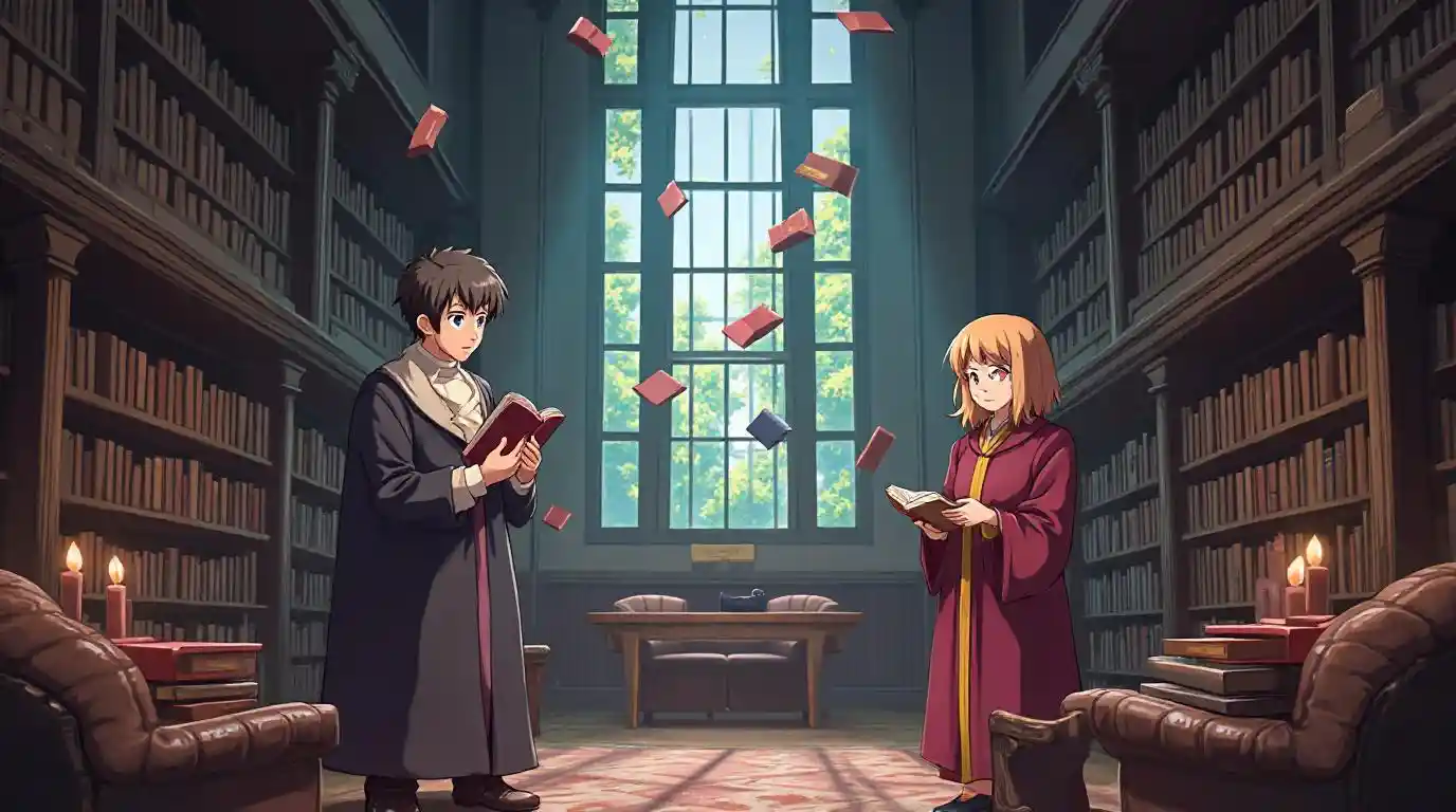 Grand library with mage scholars, floating books, in the style of magical academy anime.