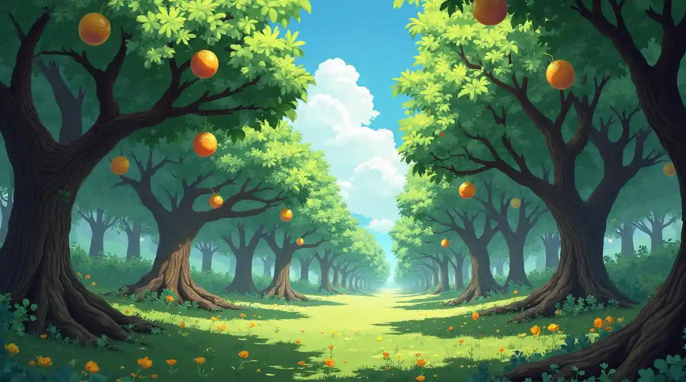 Lush orchard, fruit granting mystical abilities, akin to magic-infused anime settings.