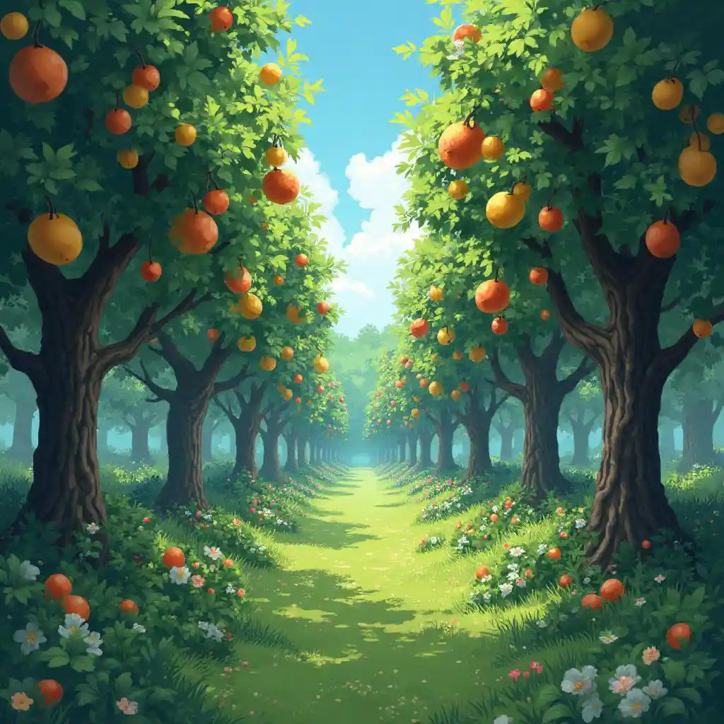 Lush orchard, fruit granting mystical abilities, akin to magic-infused anime settings.