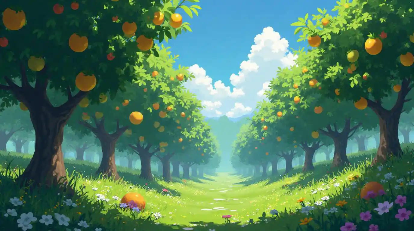 Lush orchard, fruit granting mystical abilities, akin to magic-infused anime settings.