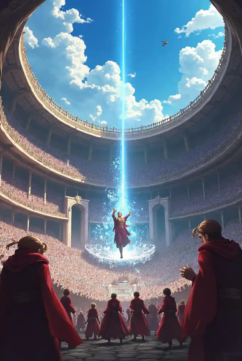 ColtonGrand coliseum, warriors battling with magic, resonating with tournament arc anime.