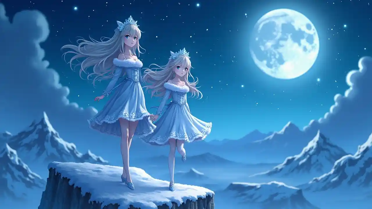Horizontal large-scale image of an Ultra HD anime girl, radiantly stunning and magical, glowing under a full moon, standing on a snowy cliff outdoors with a starry sky, wearing a fur-lined dress with a plunging neckline and thigh-high stockings, her long hair shimmering with frost and a serene smile, big shimmering eyes, glowing skin, icy blue and silver color palette, delicate features, flawless makeup, magical and serene vibes, soft glow and ambient lighting, emphasizing her graceful, well-defined chest with a subtle cleavage, and long, toned legs with a poised stance, radiating mystique and beauty.