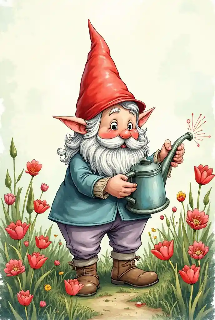 ANNAPicture book style, hand drawn texture, Watercolor borders, thick strokes, A gnome gardener tending magical flowers with an enchanted watering can