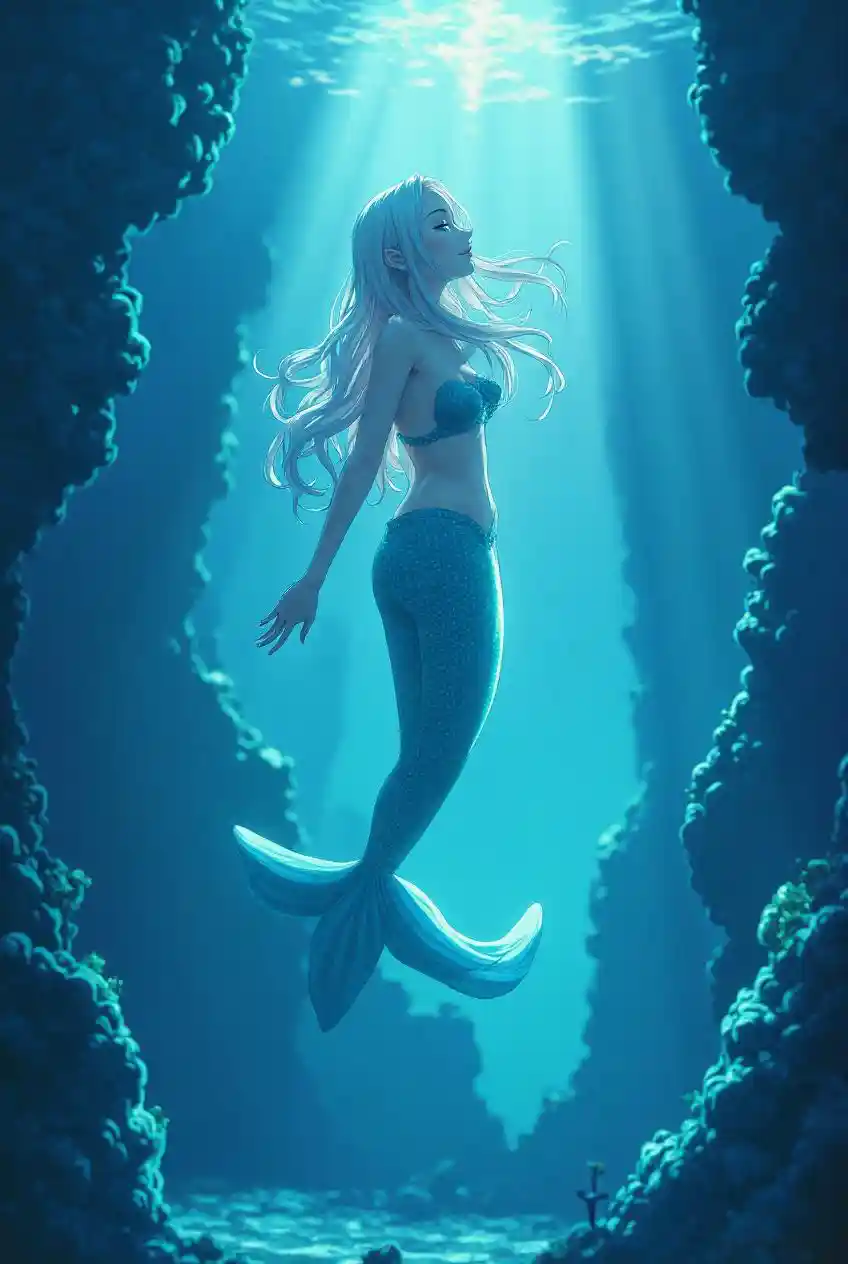 Luminous lagoon, mermaids singing enchantments, echoing serene and magical anime aesthetics.