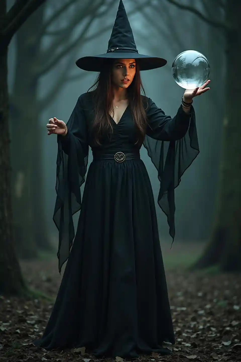 Woman Holding Magnetic Glass Ball in Witch Costume