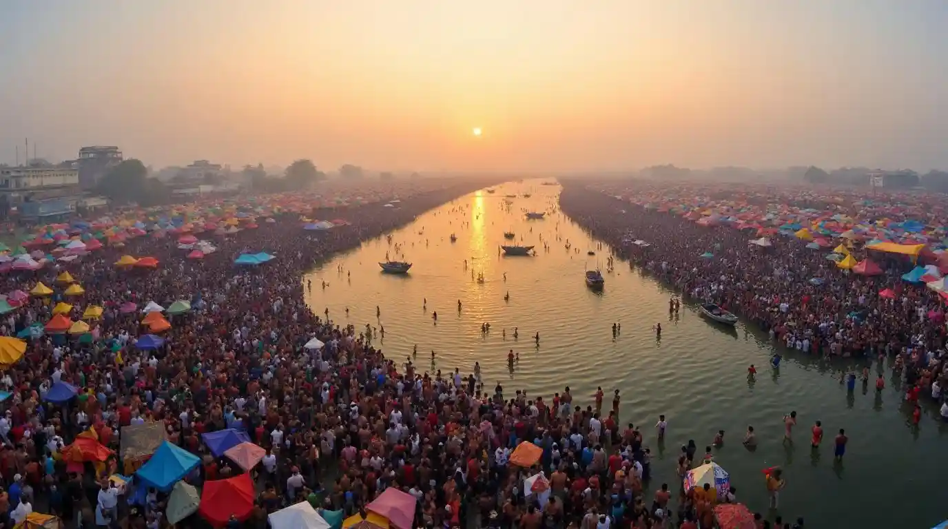 "Wide-angle aerial view of Mahakumbh 2025 in Prayagraj, showing millions of devotees gathered at the ghats of the Ganges, vibrant tents, colorful flags, and a serene sunrise in the background, capturing the spiritual essence of the event."