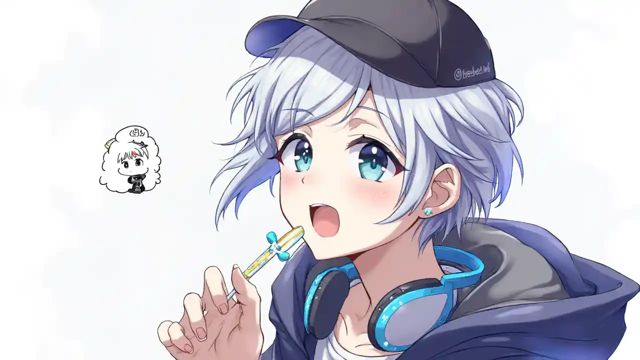 ,(artist:mazjojo:0.65), (artist:pigeon666:0.75), (artist:zawar379:0.83), (artist:remsrar:0.65), (artist:chimmyming:0.72),(artist:yoneyama mai:0.73), masterpiece, 4k, hd, amazing quality, best quality, high resolution, goldenfieldszho, newest, very aesthetic, ultra-detailed, absurdres, perfect lighting, volumetric lighting, (dark lighting), shadowing, (good shadowing), depth of field, lens flare, scenery, amazing aesthetics, cinematic lighting, cinematic, shading, (good shading), counter_shading, ,handsome,interesting, (boy:2.0),male focus, bara,interesting, :},sexy,solo, looking at viewer, short hair, open mouth, blue eyes, simple background, shirt, long sleeves, 1boy, hat, white background, jewelry, blue hair, jacket, white shirt, upper body, white hair, male focus, multicolored hair, earrings, food, hood, black headwear, hoodie, headphones, piercing, ring, hood down, ear piercing, candy, baseball cap, lollipop, headphones around neck, holding lollipop,grid background,dynamic pose,dynamic angle,Magazine cover,(Fake cover:2.0),(chibi inset:1.2),