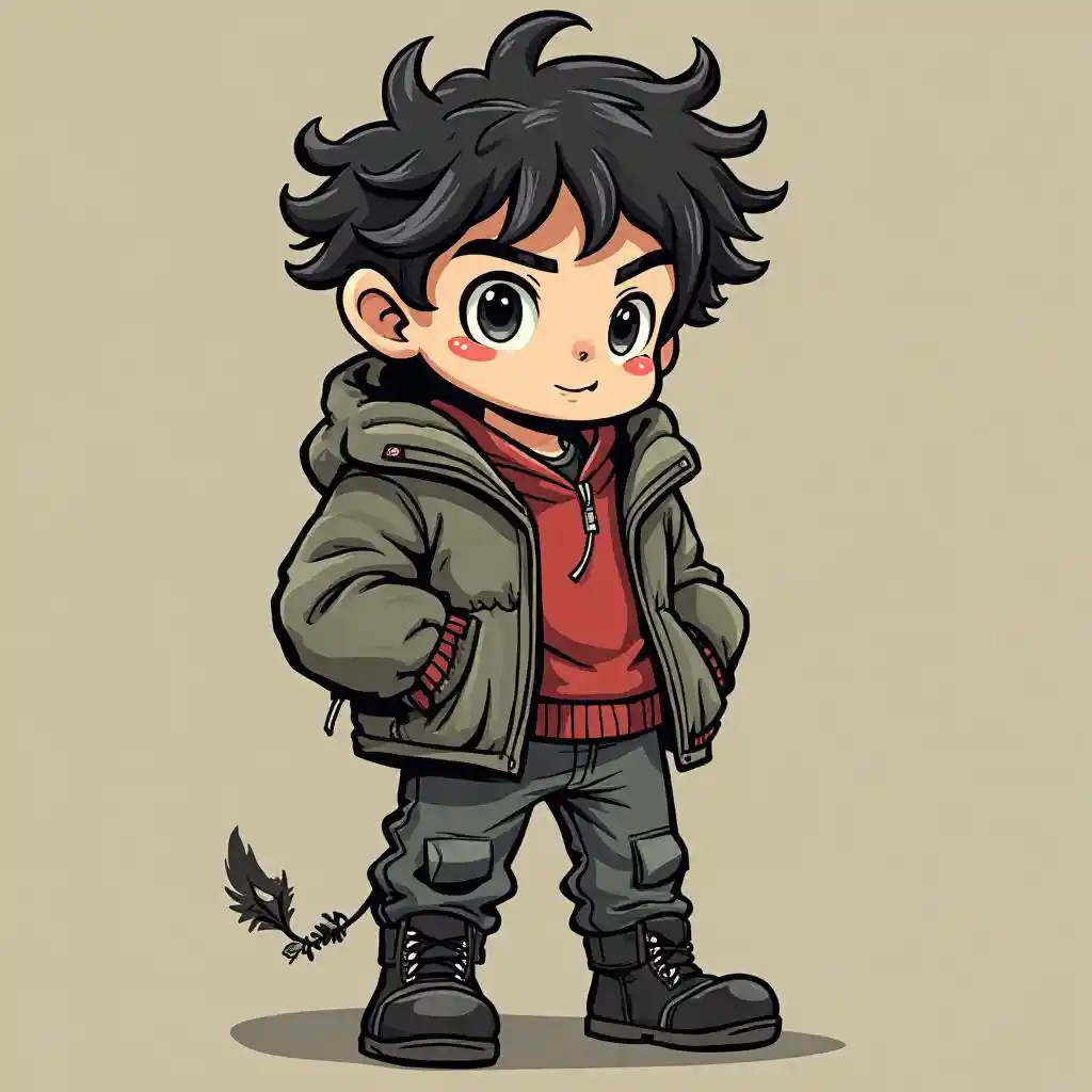 crea un ragazzo con capelli mori lunghi occhi marroni snello con una felpa grigia cargo neri e scarpe nere in stile manga
