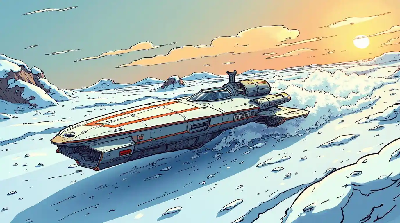 A Snow Speeder from Star Wars: The Empire Strikes Back movie, illustrated in a manga style, with sleek lines and exaggerated dynamic motion. The hovering vehicle is shown speeding through an icy landscape, with motion lines and a vibrant colors, energetic atmosphere typical of 90s manga. Emphasize the power and speed of the vehicle, all captured in the bold, stylized art of classic manga. imagination,surrealism,iridescent colors,complimentary colors,high resolution,high quality,high sharpness,high contrast,vibrant colors,close-up,golden composition,8k,HD HD--v 6.1