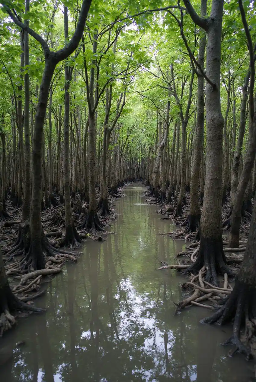 A mangrove forest, with roots weaving intricate patterns in tidal waters.