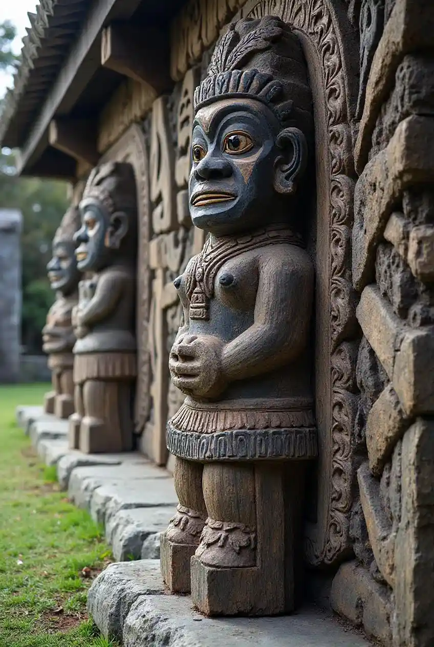 Maori marae in New Zealand, carvings guarding ancient lore.