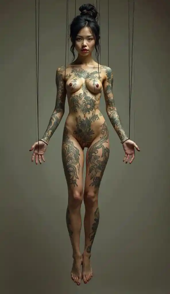 Female figure, Asian, young adult, suspended by strings like a full-body puppet and floating, Marionette style. Detailed tattoos adorn her arms and torso. She i
