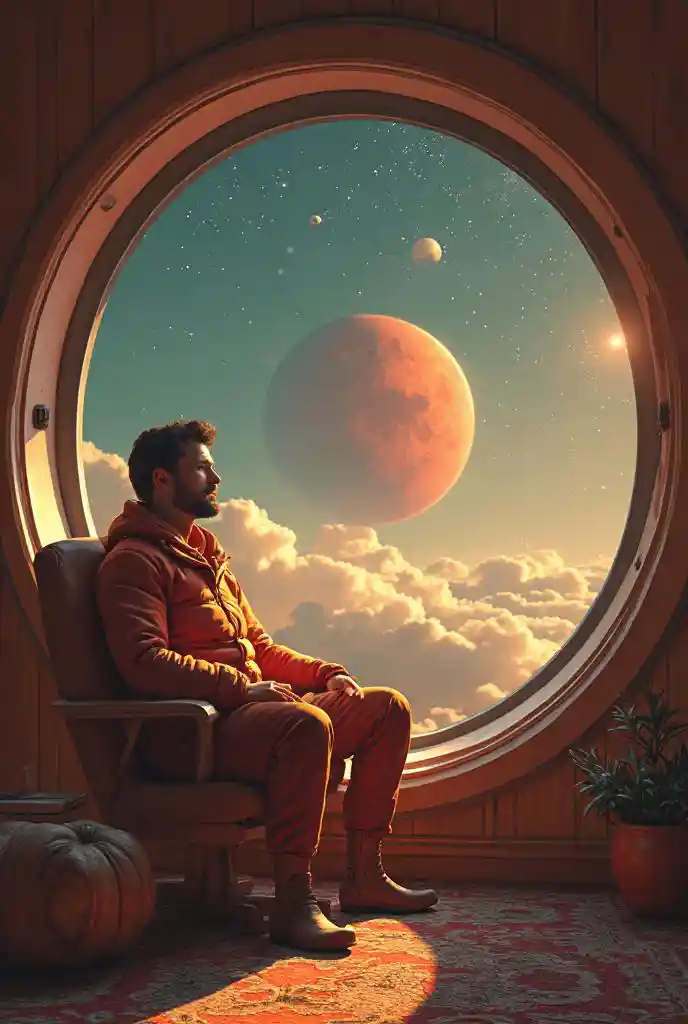 futuristic retro design , poster, advertising a flight to Mars . male (fantastic clothes from the far future) sitting in a cozy room, looking out the round