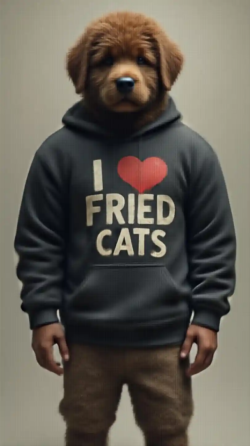 JoannaUltra-realistic cinematic portrait, massive Tibetan Mastiff wearing rugged black hoodie with distressed 'I ♡ FRIED CATS' slogan in dripping hot sauce font, ches