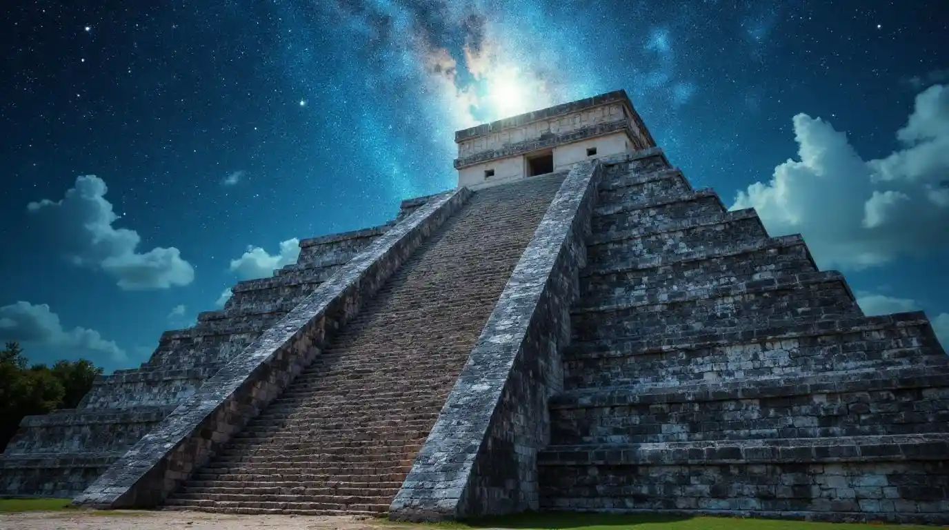 A Mayan pyramid in Yucatan, stairs ascending to the cosmos.