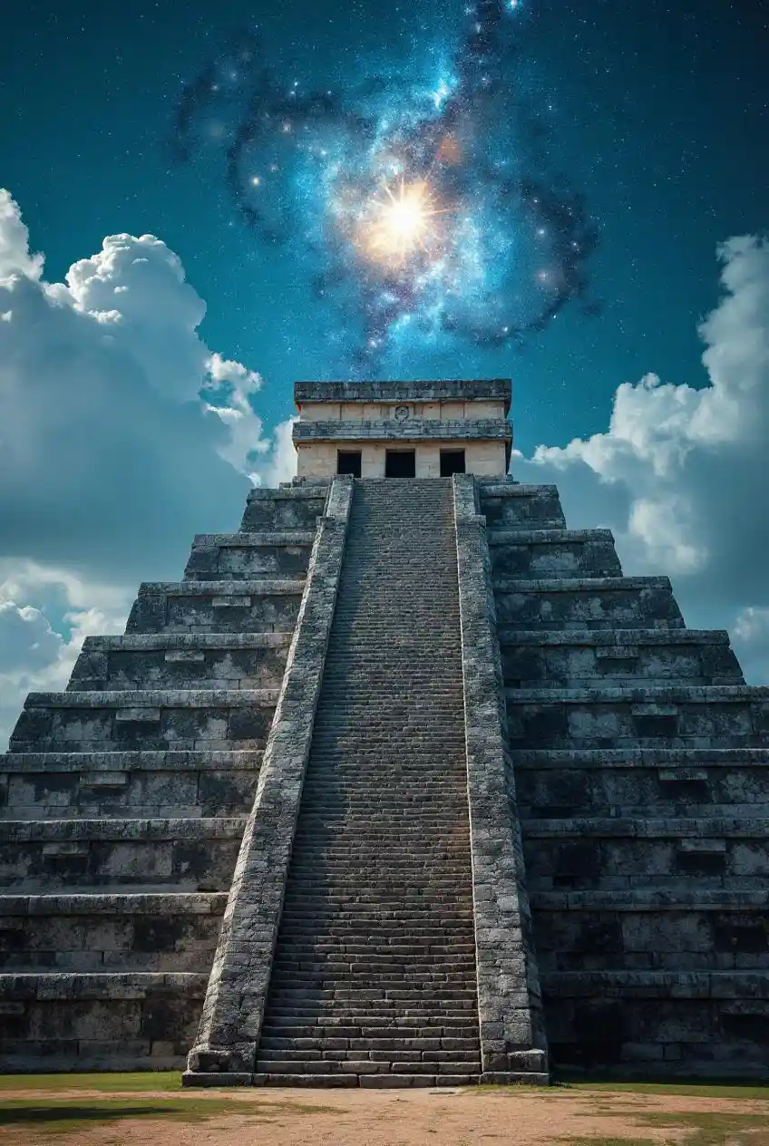 A Mayan pyramid in Yucatan, stairs ascending to the cosmos.