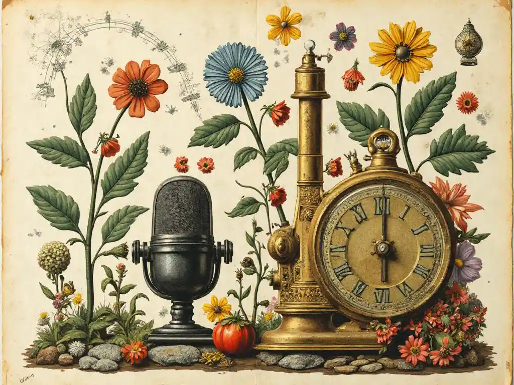 Mechanical Botanical Garden: Retro Collage * Main materials: Cutouts of precise mechanical diagrams from old scientific magazines (clock gears, brass pipes, mic