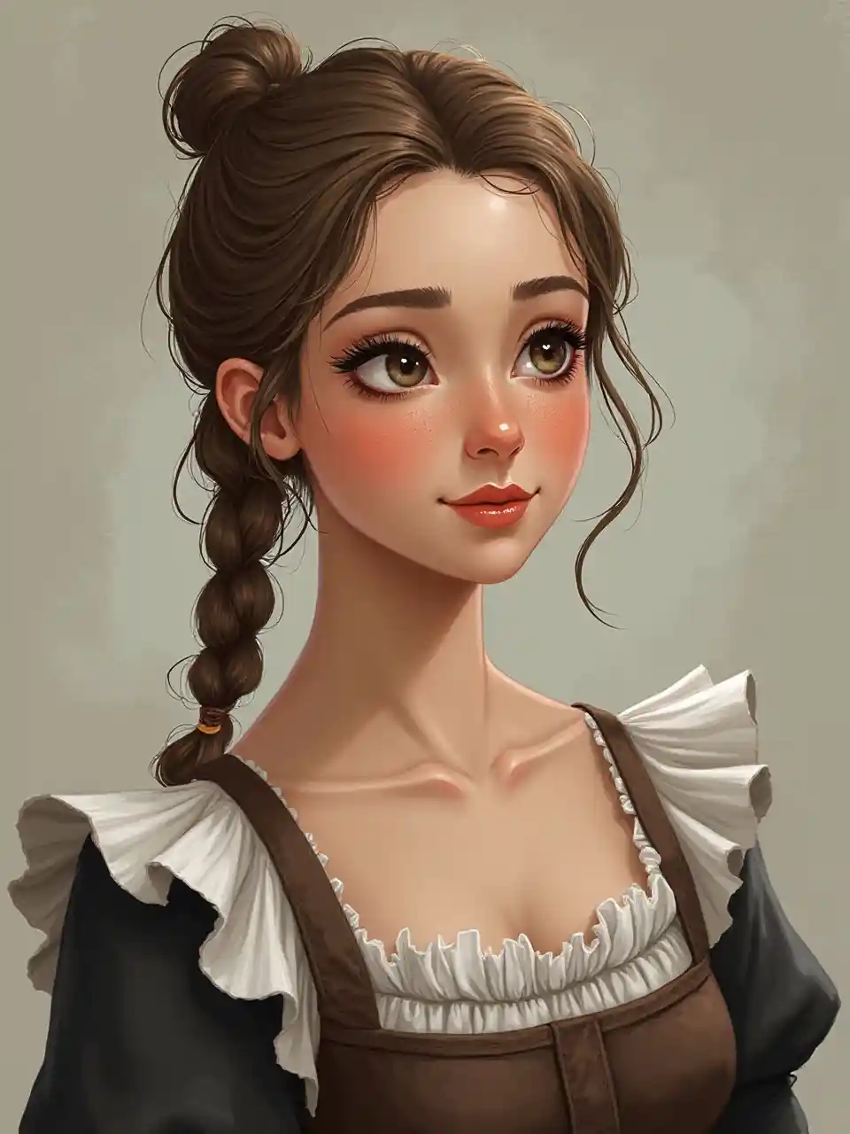 Create a softened depiction of a girl resembling Leah McNamara, dressed in a medieval maid's outfit with neatly tied hair. Apply a moderate amount of makeup, featuring subtle orange tones on the cheeks, natural-looking eyebrows, and a gentle downward gaze. Keep the overall makeup light, with a touch of foundation for a soft and natural appearance. The lips can be painted in a gentle, neutral tone, while the eyes receive a light touch of eyeshadow and eyeliner for a more subdued effect. Strive for a sweet and approachable look, maintaining the essence of a medieval maid-inspired appearance with a milder and more charming touch.