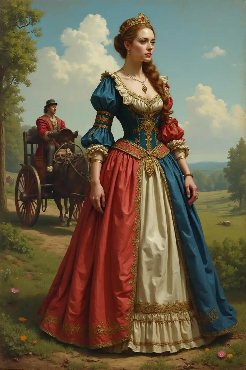 Medieval landscape, A woman in a beautiful, colorful dress standing with a debt, Scene with a nice carriage,exquisite texture and detail, Old-fashioned color, L