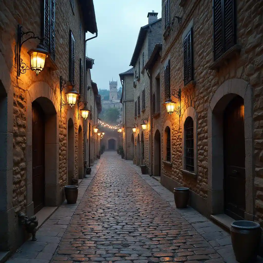 JaceCobblestone streets of a medieval town, with lanterns lighting up historic facades.