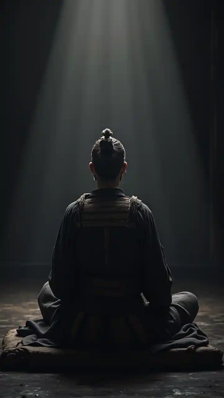 a samurai man sitting and meditating in darkness, old classical japanese style