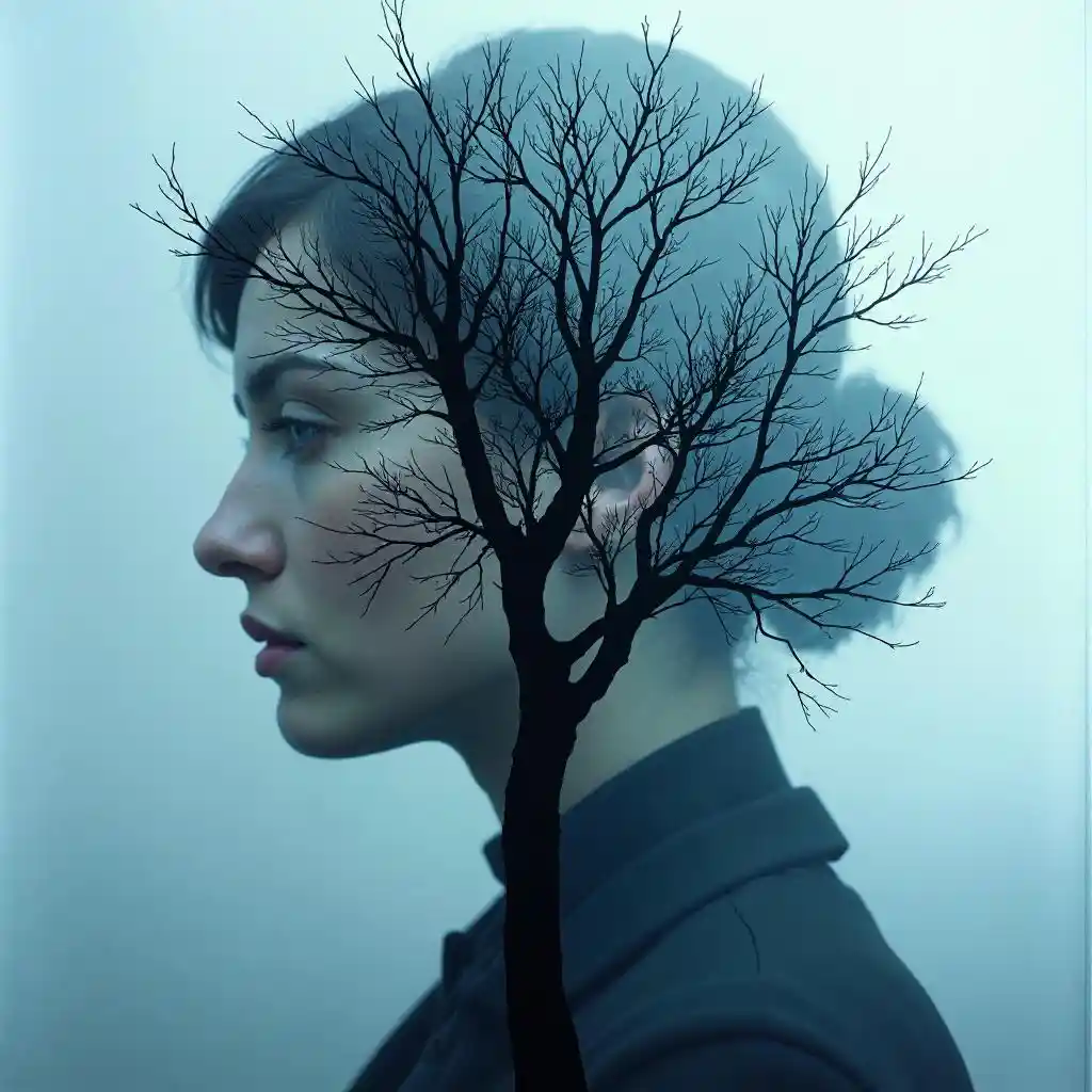Explore the haunting beauty of double exposure photography with this captivating portrait. The image is a woman's pensive face overlaid with the bare branches of a winter tree, creating an introspective and melancholic atmosphere. The cool blue tones add to the overall moody feel, while mixed reality technology brings depth and realism to the composition. This photo was captured on Zenit 11, Helios 44 film grain camera, further enhancing the artistic expression of this stunning image.