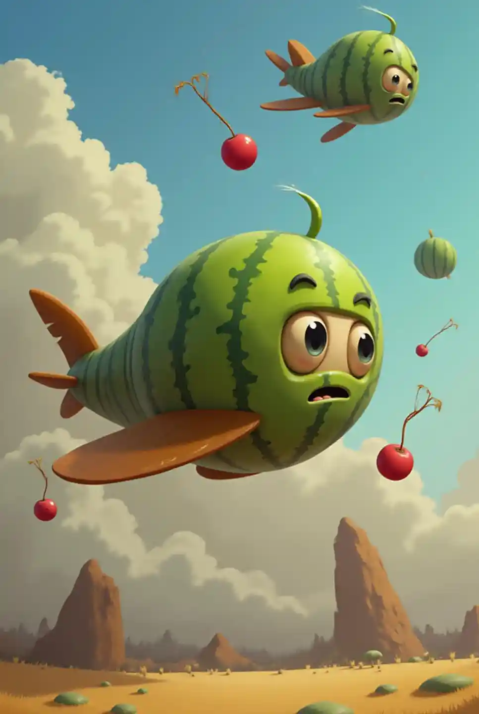melon flying bomber, Drops cherries as bombs, Worms as a pilot, pixar style