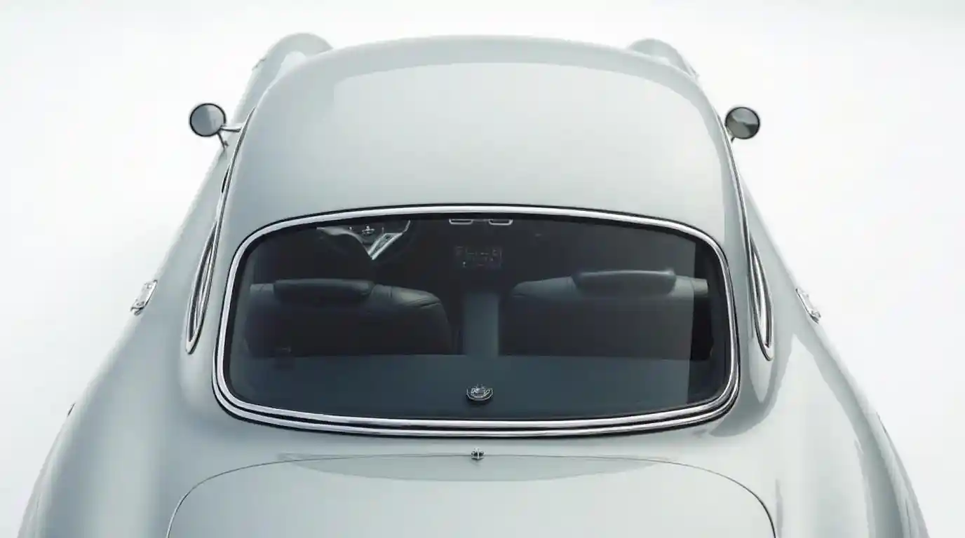 OwenClose-up detail of the rear window and interior view from above of a silver-grey vintage Mercedes-Benz SLR, against a white background, studio photography, in the style of Peter Lindbergh.
