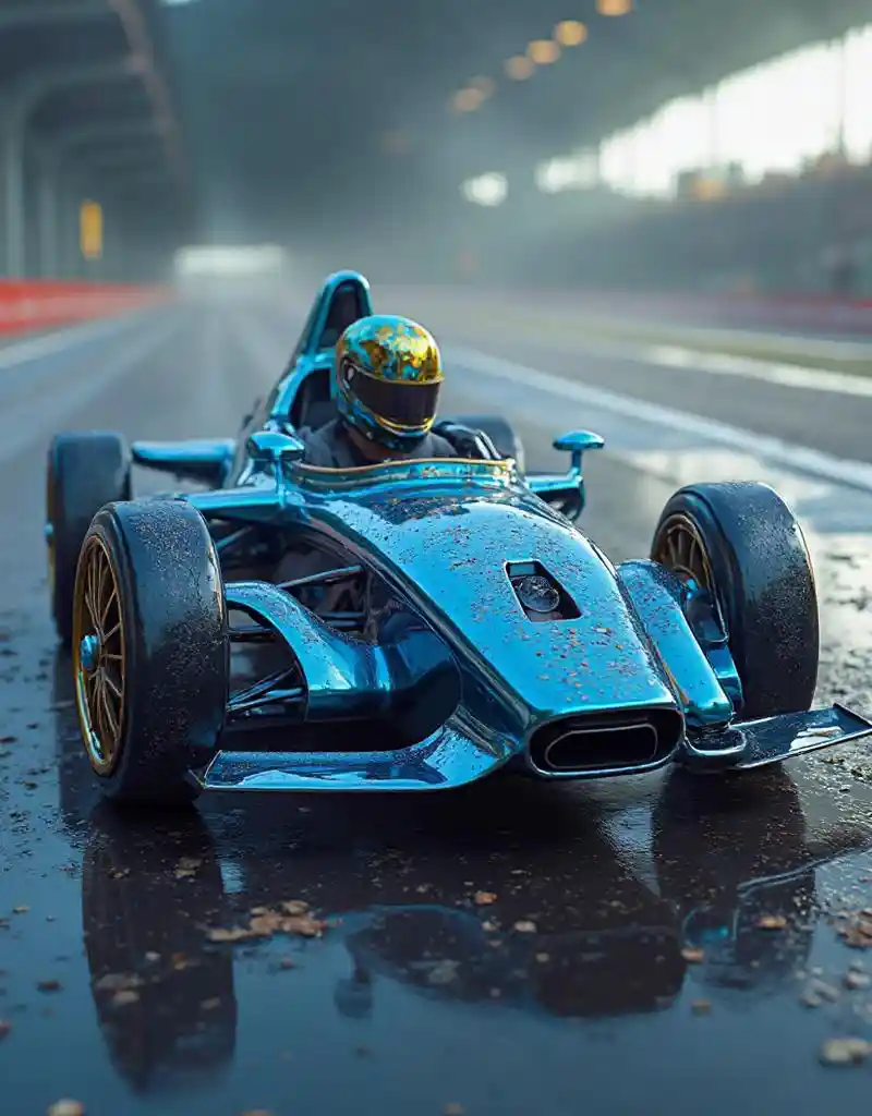 Jocelynsuper realism, (the new F1 race track),( a wacky steampunk racing car from the near future),( 1 beautiful sexy race queen)is a metallic racing car、((a blue meta