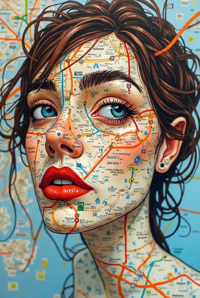 Vibrant metro maps swirl around a serene woman's face, as if city routes have become the brushstrokes of her portrait. Orange lines define her eyebrows, while t