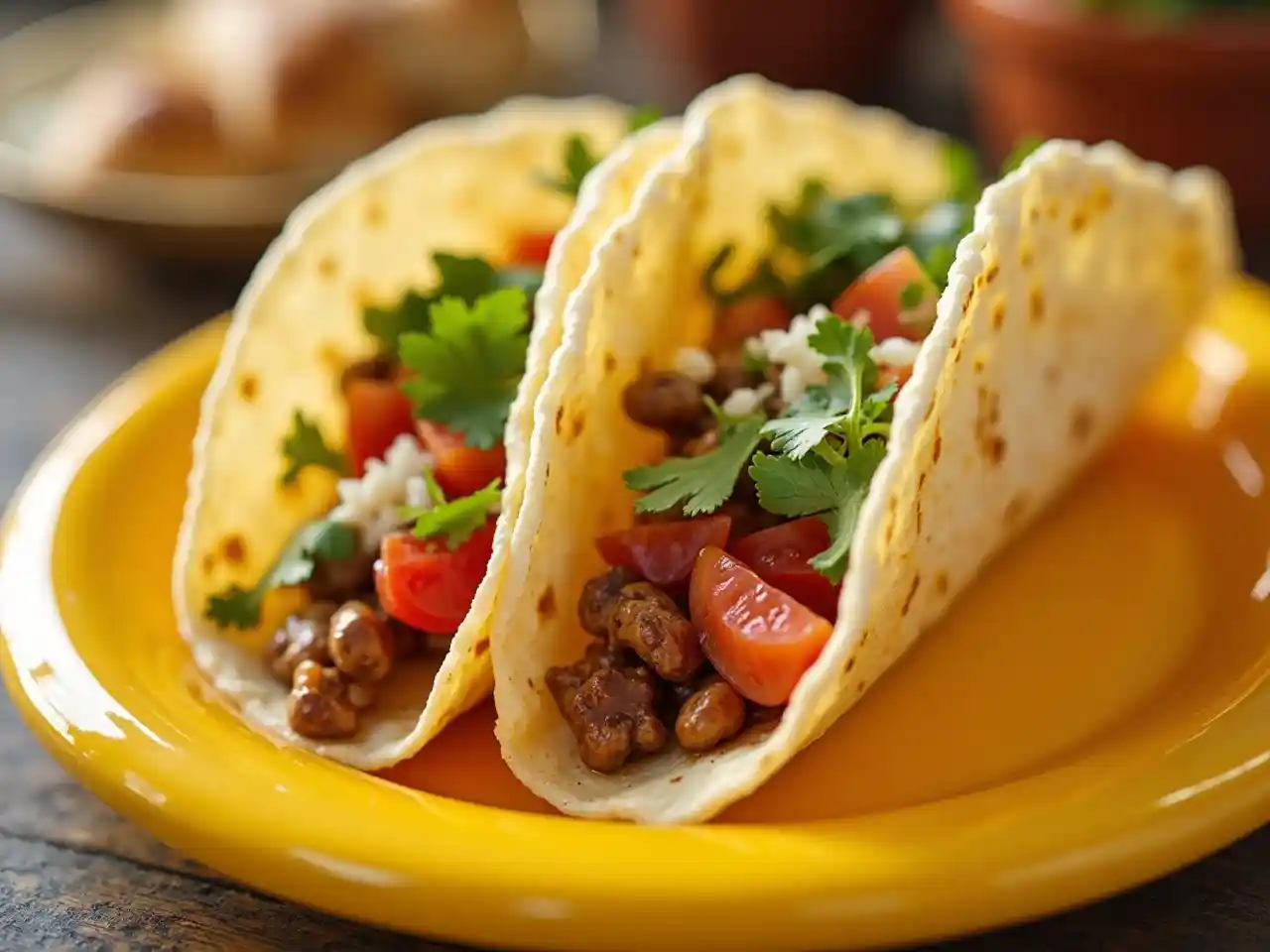 soft open flour tortilla mexican taco. The Taco is over yellow plate