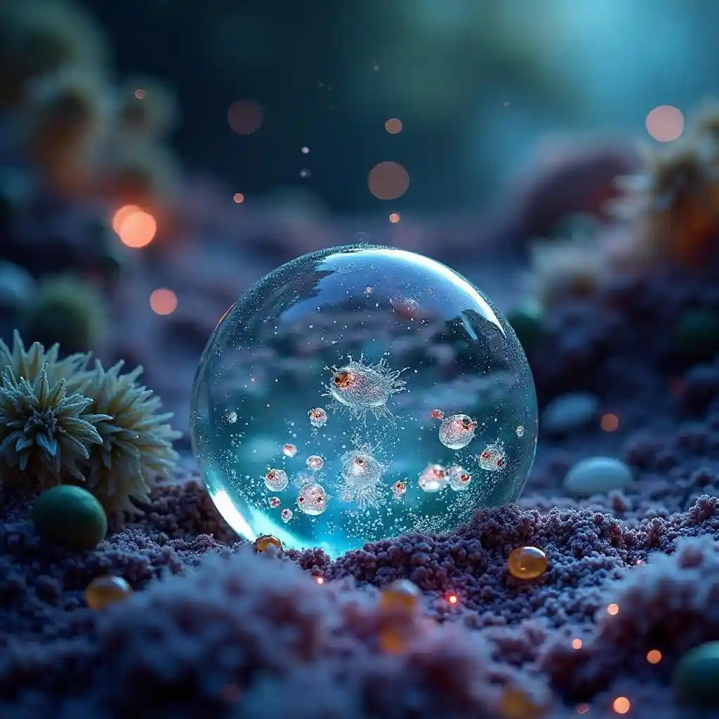 DanielA microscopic fantasy world hidden inside a single drop of water, glowing planktons and mysterious tiny creatures swimming in an alien-like fluid, macro lens, s