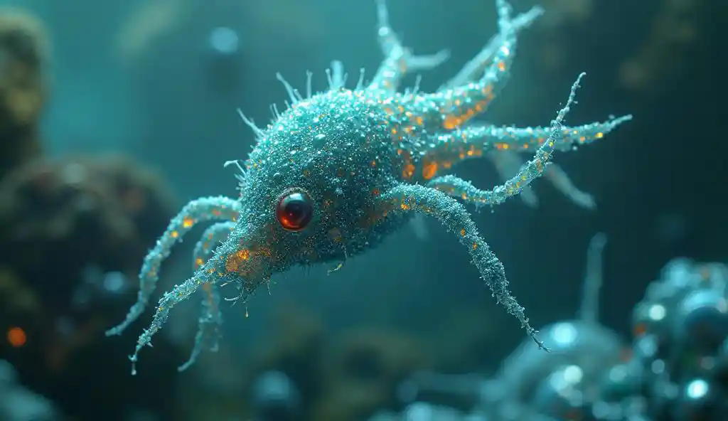 4k, cyberpunk, In the water, the microscopic world, the microcosm, microorganisms. Intelligent organisms.