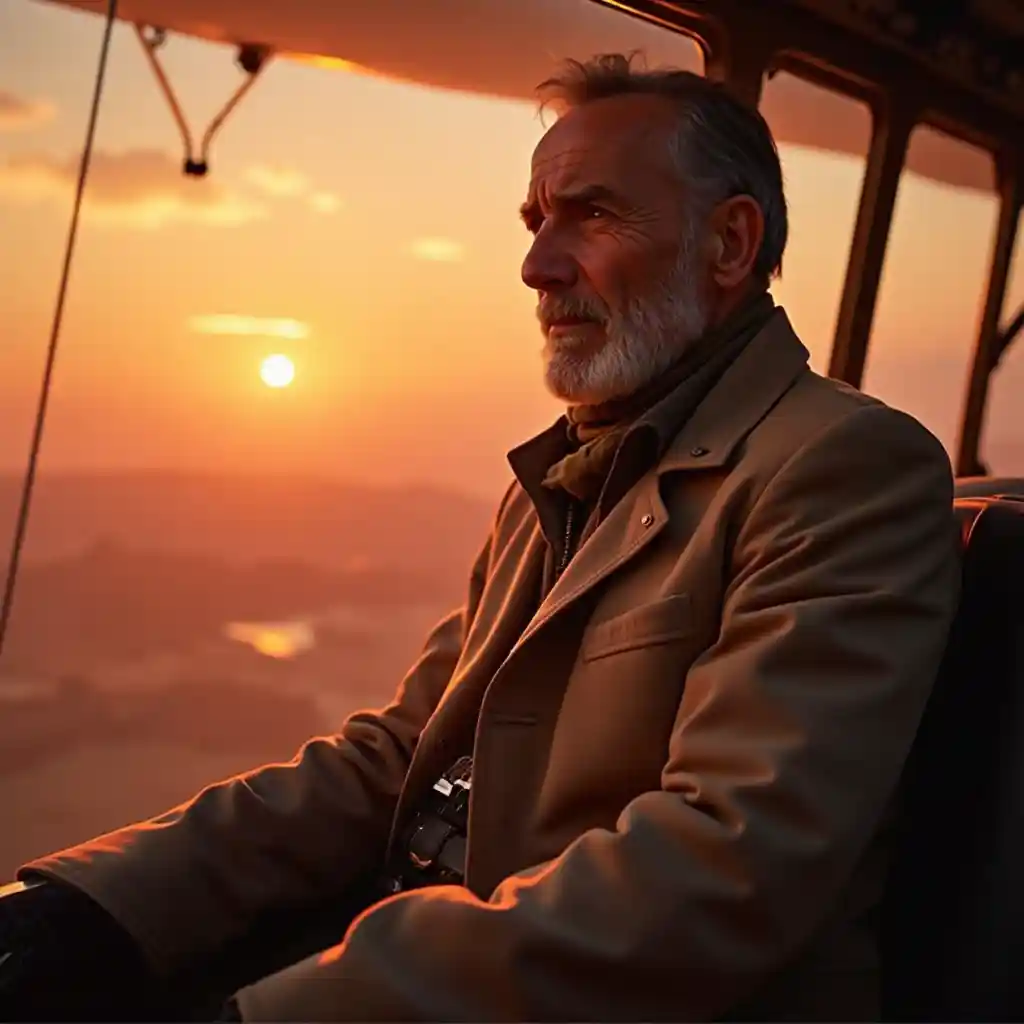 Piloting a zeppelin through a crimson sunset, a Middle Eastern man in his 50s glows in a pilot’s greatcoat. Sand dunes and distant cities frame him, his calm control and weathered face exuding adventurous wisdom and timeless charisma in a vast, aerial scene.