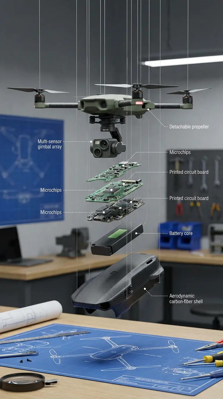 A fully exploded diagram of a compact military drone, with detachable propellers, sensors, microchips, battery core, and aerodynamic shell floating apart.