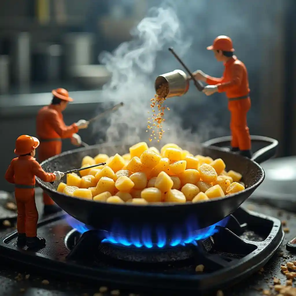 "Tiny workers in orange suits cook golden-brown potatoes in a giant pan over a blue flame. They use industrial tools, while a mini bucket sprinkles seasoning. Steam rises, creating a cinematic kitchen scene."