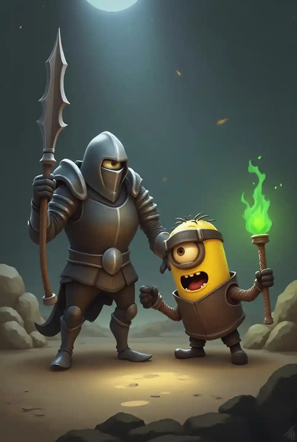 EastonMinion knight with kiwi morgenstern in fight with other minion with sellerie pike, in arena, and having fun