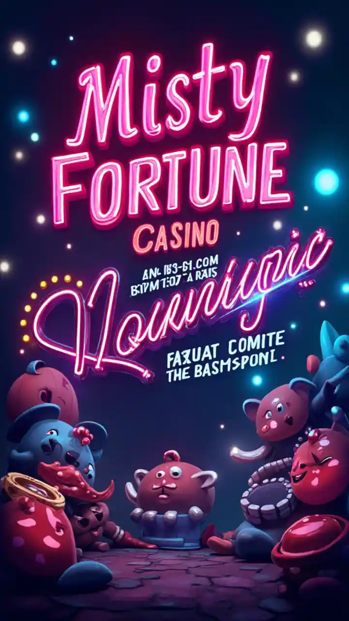 (accurately spelled text "Misty Fortune Casino 100% Legit No Scams"), vibrant neon colors, glowing casino elements, bold font, edgy design, urban vibe, dynamic composition, high contrast, energetic atmosphere, captivating visual appeal, promoting excitement, modern aesthetic, ultra-detailed, perfect for a casino flyer, inviting yet intense, cool tones blended with bright neon accents.