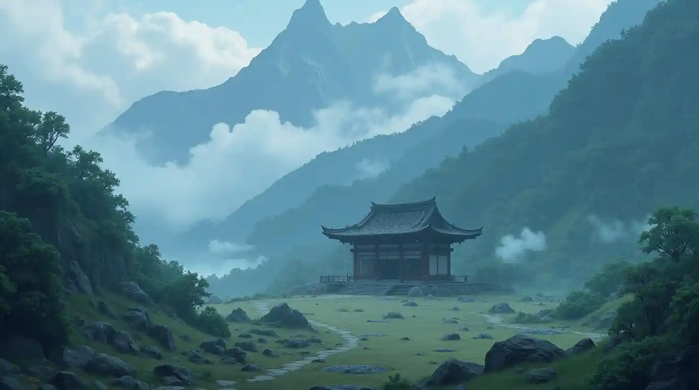 Mystical Shrine in Foggy Anime Mountains