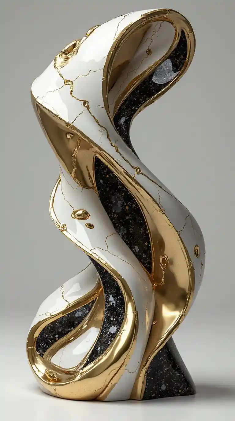 a flowing modern, abstract sculpture with a futuristic design. It features a combination of gold, white with gold edges and surface veins and black colors with intricate geometric shapes