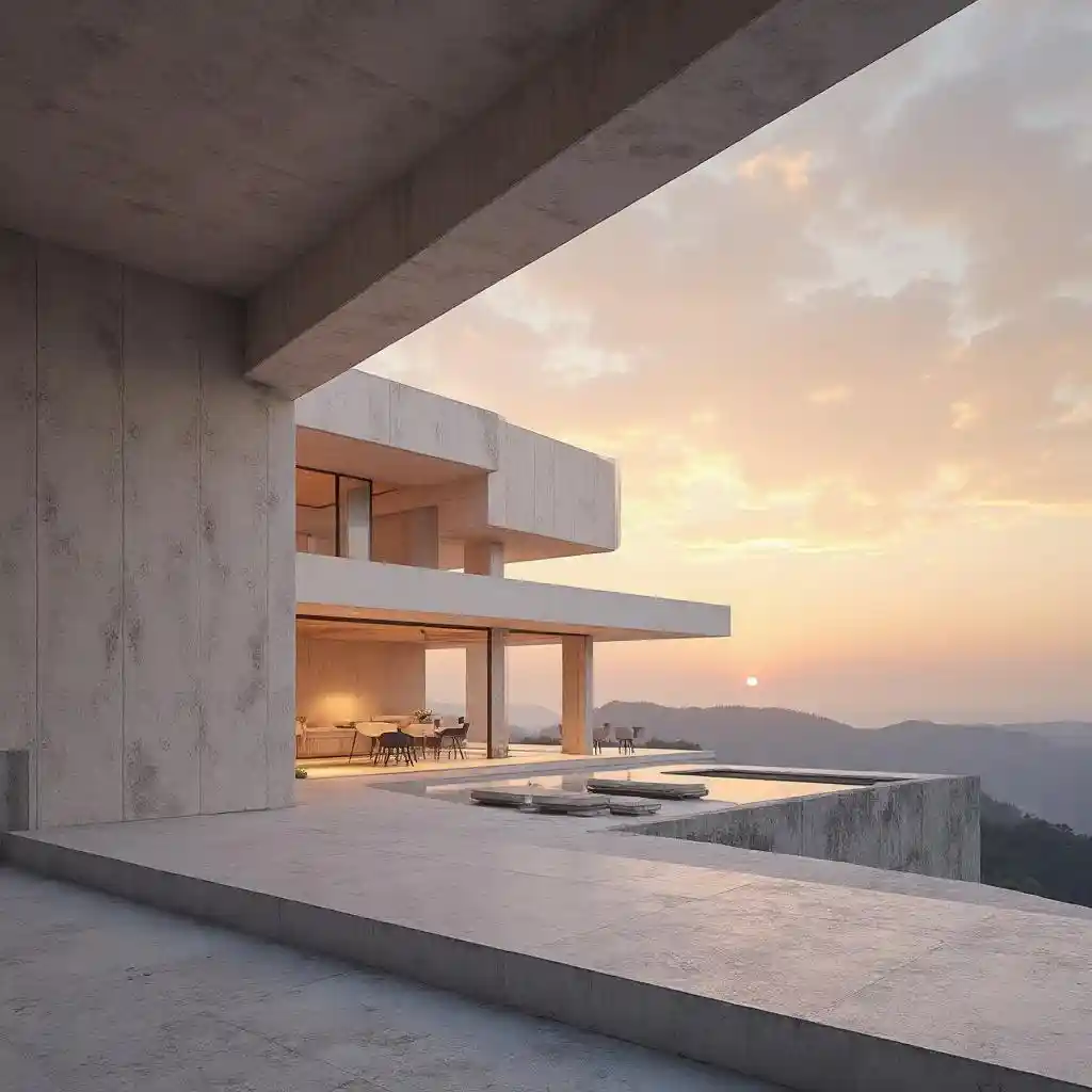 modern, minimalist architecture, exposed concrete with no ceiling. a pastel sunset, modern architecture, paceful atmosphere, taken with Canon EOS R5