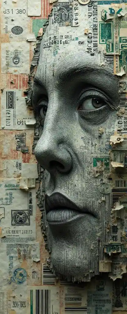 Mila/imagine prompt: A haunting digital collage of a human face constructed from torn dollar bills, shredded passports, barcodes, and QR codes, stitched together li
