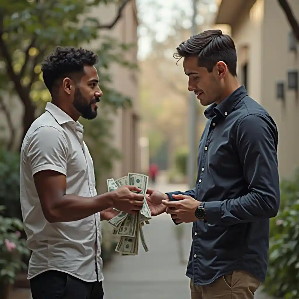 stxphCreate an image of a man giving his friend a bundle of dollars.