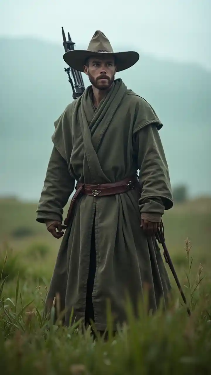 Coltongreen grass, fog, near the lake, blurred background, dawn, Mongolian male soldier, ancient robe, quiver, bow, hat, walking in grass, thoughtful face expression, short beard