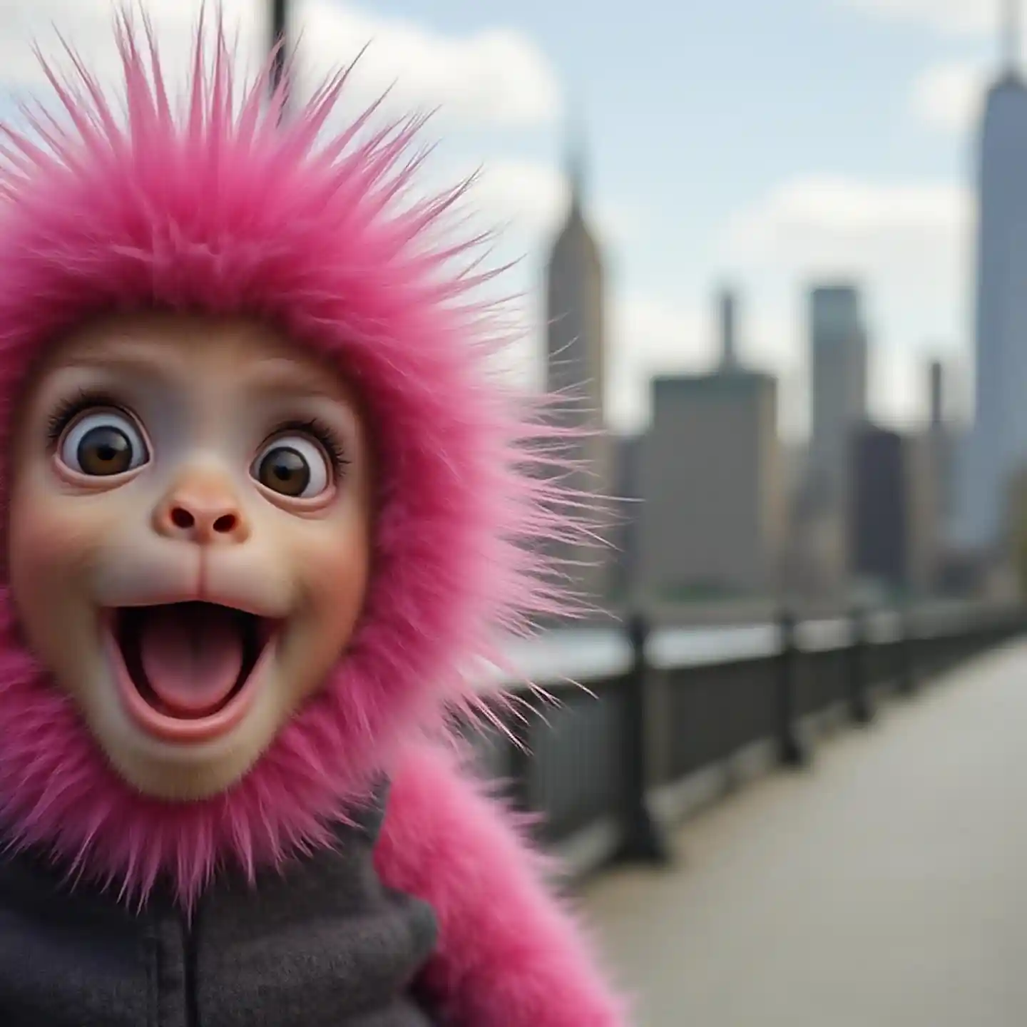 Selfie of a pink cute baby hairy monkey smiling, New York City is in the background