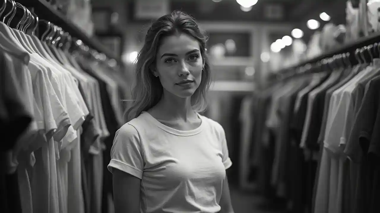 Extremely detailed photographic image, grained image, beautifully composed, monochrome image, 50's fashionable image, fashionable magazine photography, leica summicron 35mm f2.0, kodak 400tx, fashion photography, fashionable model, william s. burroughs, Woman wearing T-Shirt in Clothing Store Mockup