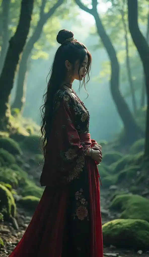 PianeerMononoke Hime, Portrait of a woman standing in a beautiful mountain forest, quiet forest, Beautiful natural scenery, voluptuous costume, mysterious look, 4K, R